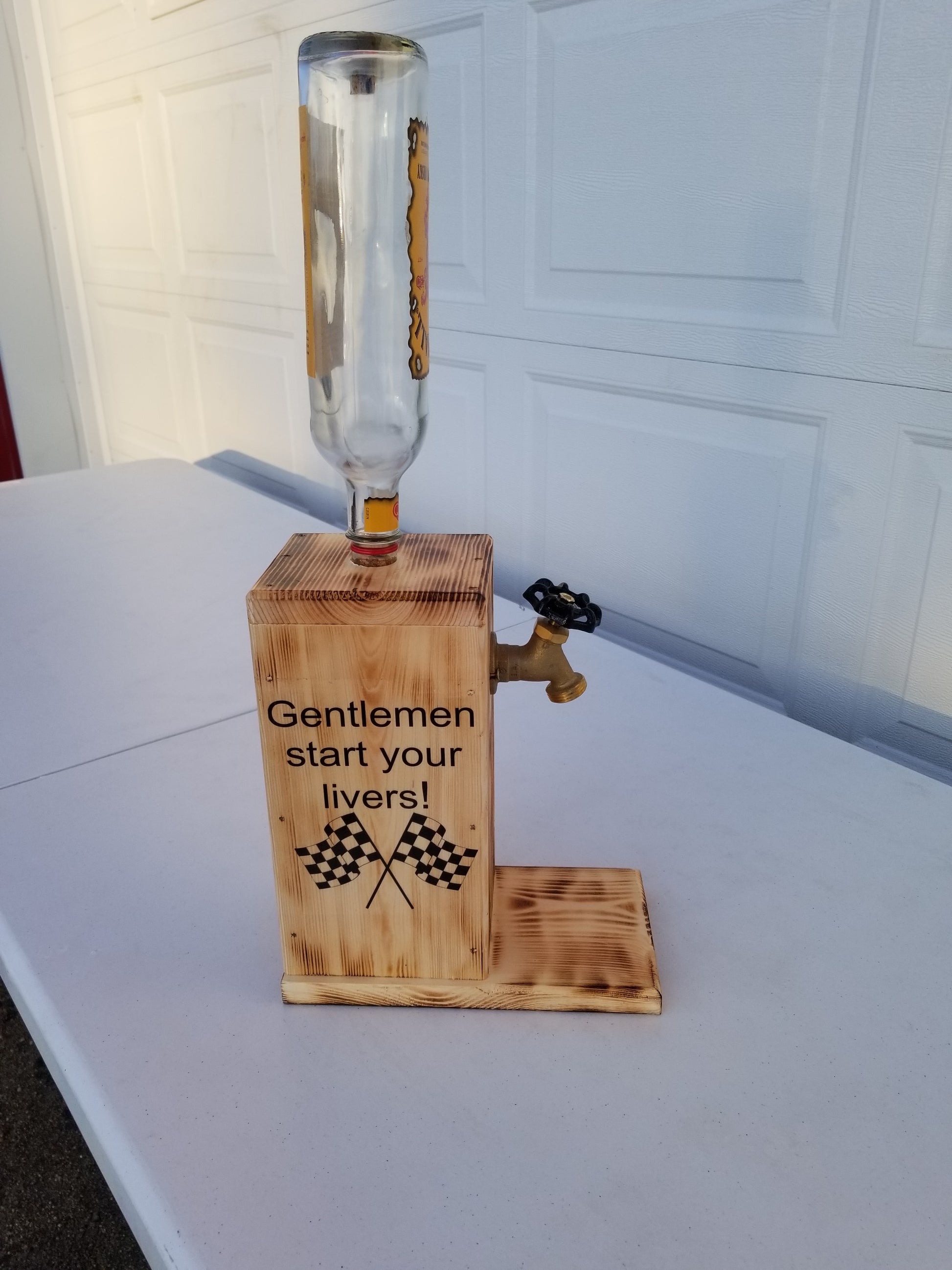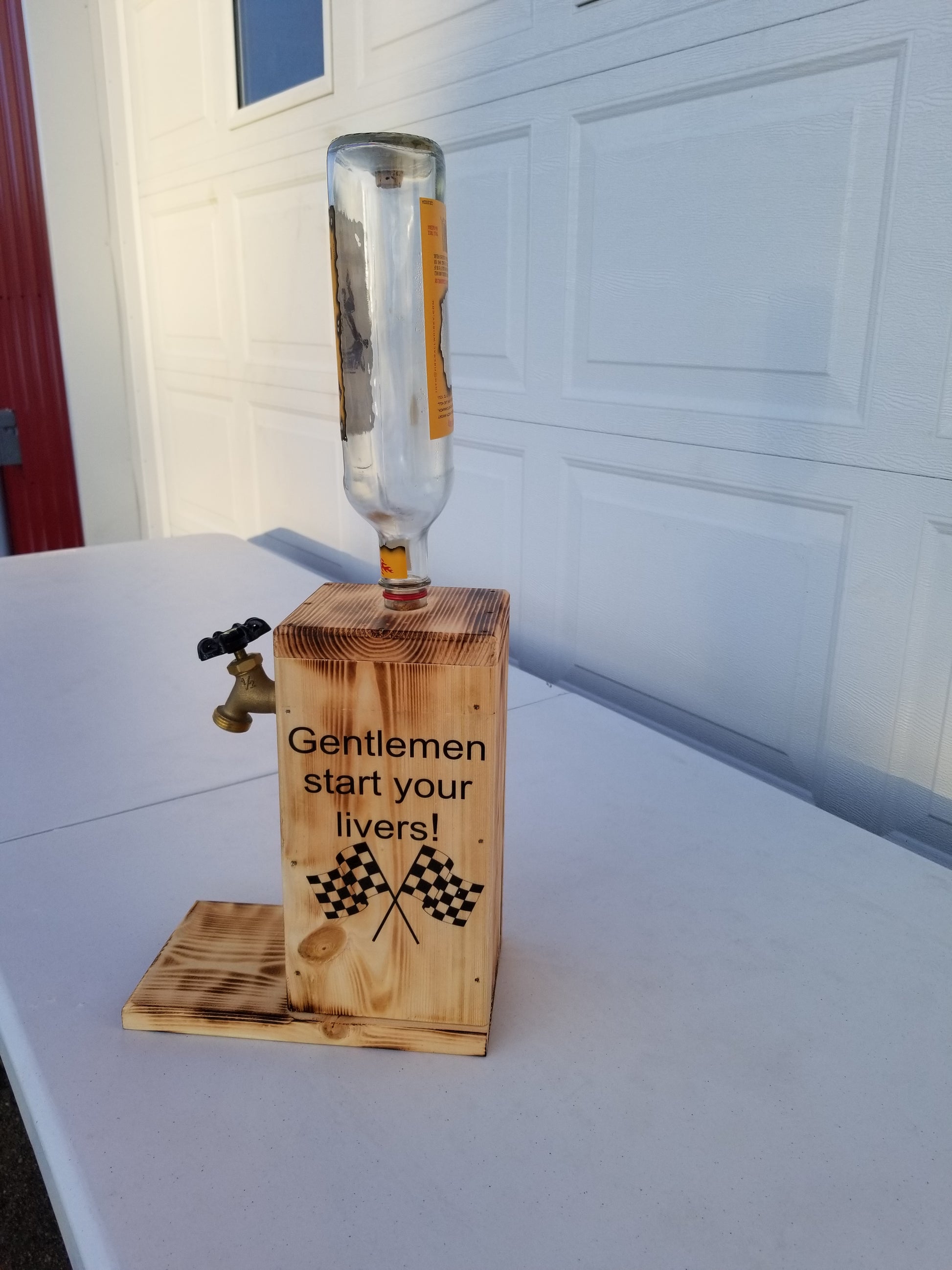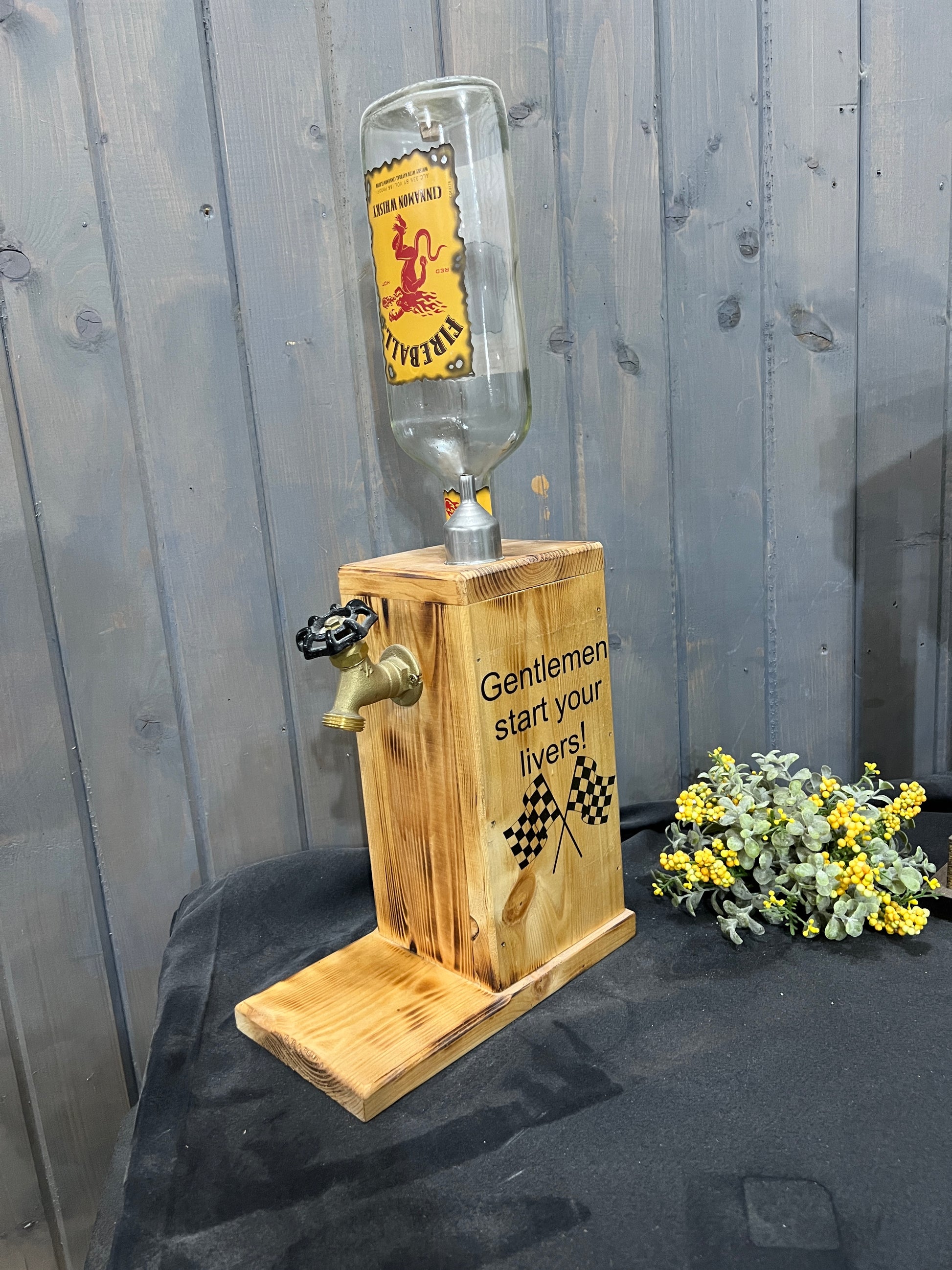 Handmade Fireball dispenser with “Gentlemen, Start Your Livers” checkered flag design on both sides. Permanent bottle, refillable, and fully functional. No alcohol included.