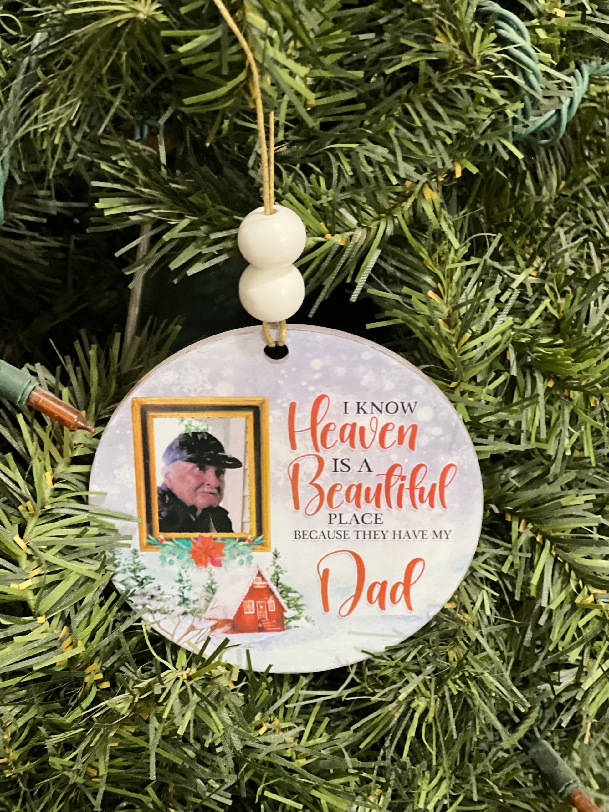 The touching phrase "I KNOW HEAVEN IS A BEAUTIFUL PLACE BECAUSE THEY HAVE MY DAD" can be accompanied by a personalized photograph, expertly heat-pressed onto the surface, ensuring a durable and lasting display of your cherished memory.