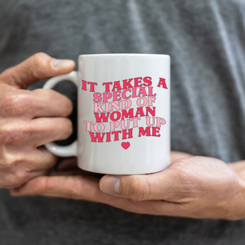 Celebrate the incredible woman in your life with this fun and heartfelt 15 oz ceramic coffee mug! Featuring the phrase "It Takes a Special Kind of Woman to Put Up With Me," this mug is the perfect gift for the one who loves you despite your quirks. Ideal for anniversaries, Valentine’s Day, or just because, this durable, microwave-safe mug will brighten her day with every sip.