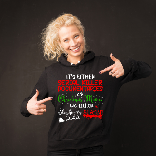 Stay cozy and stylish with our Classic Comfort Crewneck Sweatshirt, perfect for those days when it's either serial killer documentaries or Christmas movies—because we’re either sleighin’ or slayin’! Made from a premium blend of soft cotton and polyester, this sweatshirt provides warmth without the bulk. Its relaxed fit and ribbed cuffs ensure a snug yet breathable feel, perfect for layering during colder months or wearing on its own for a cool evening in.