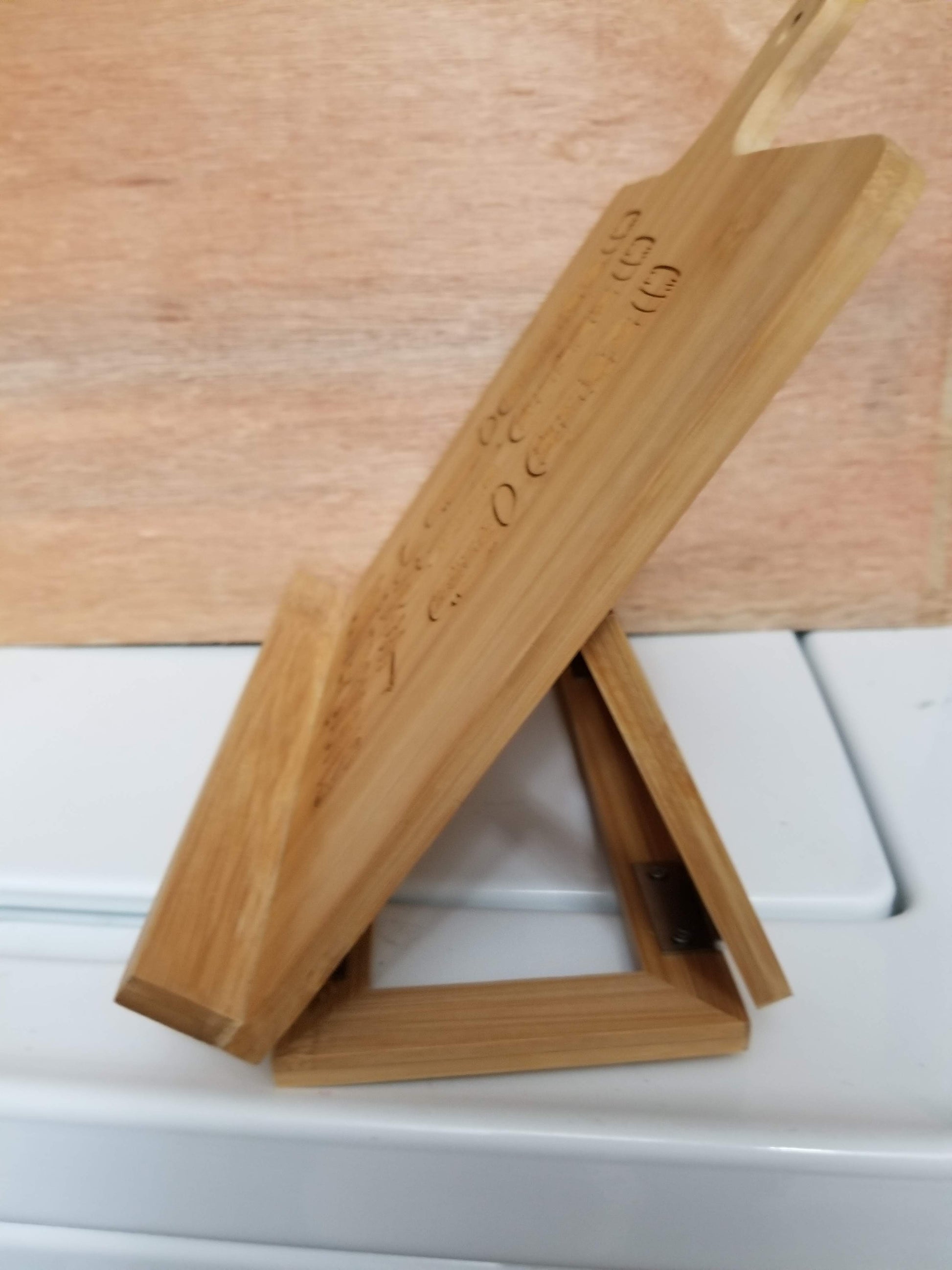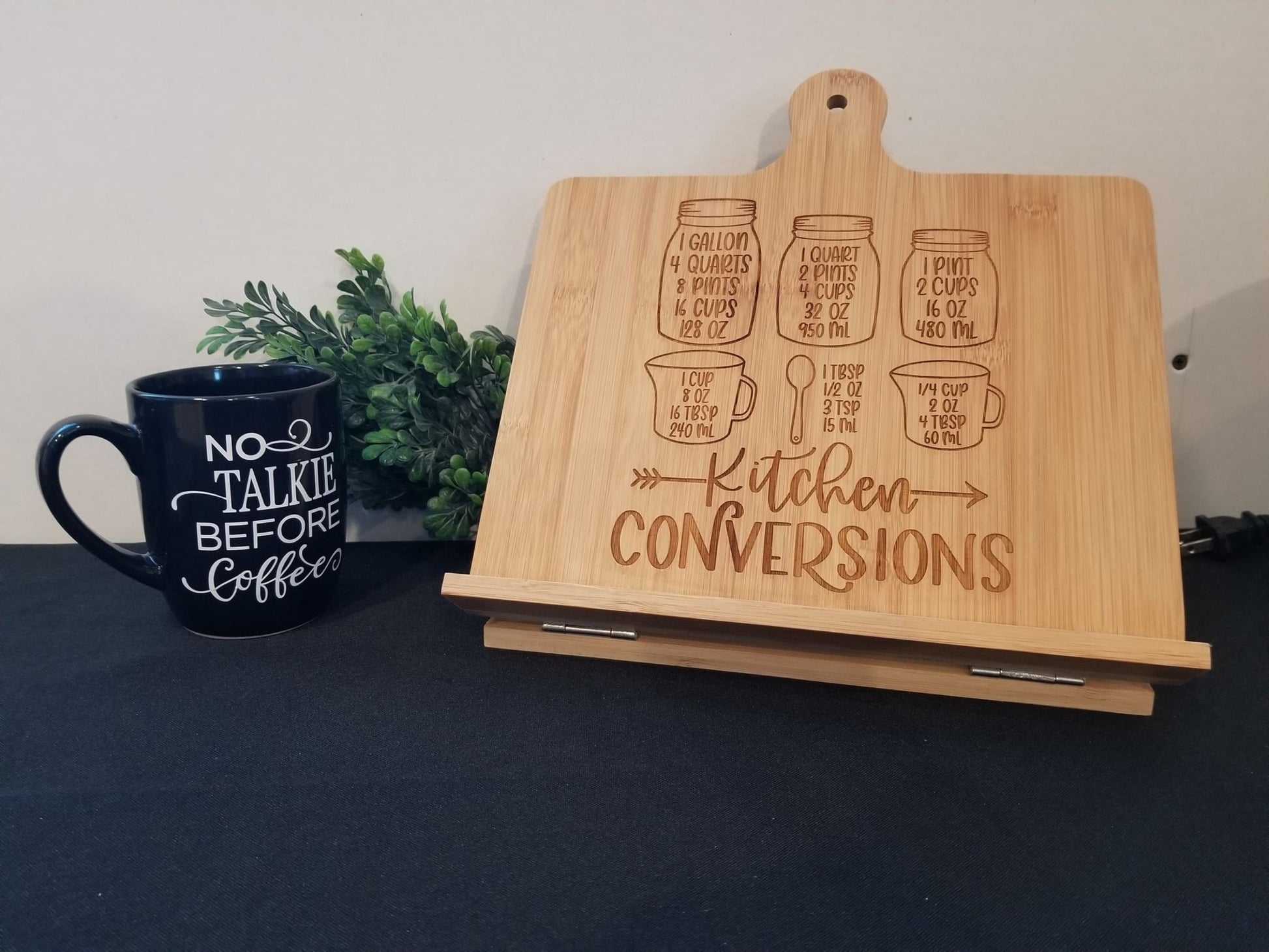 Really cute easel for your kitchen counter with the "kitchen conversions" on it. Who doesn't wonder how many cups are in quart every once in awhile? Can hold a recipe book or your IPAD as you are cooking away. Measures 10 1/4 by 10 1/4, Can be folded to lay flat when not in use.