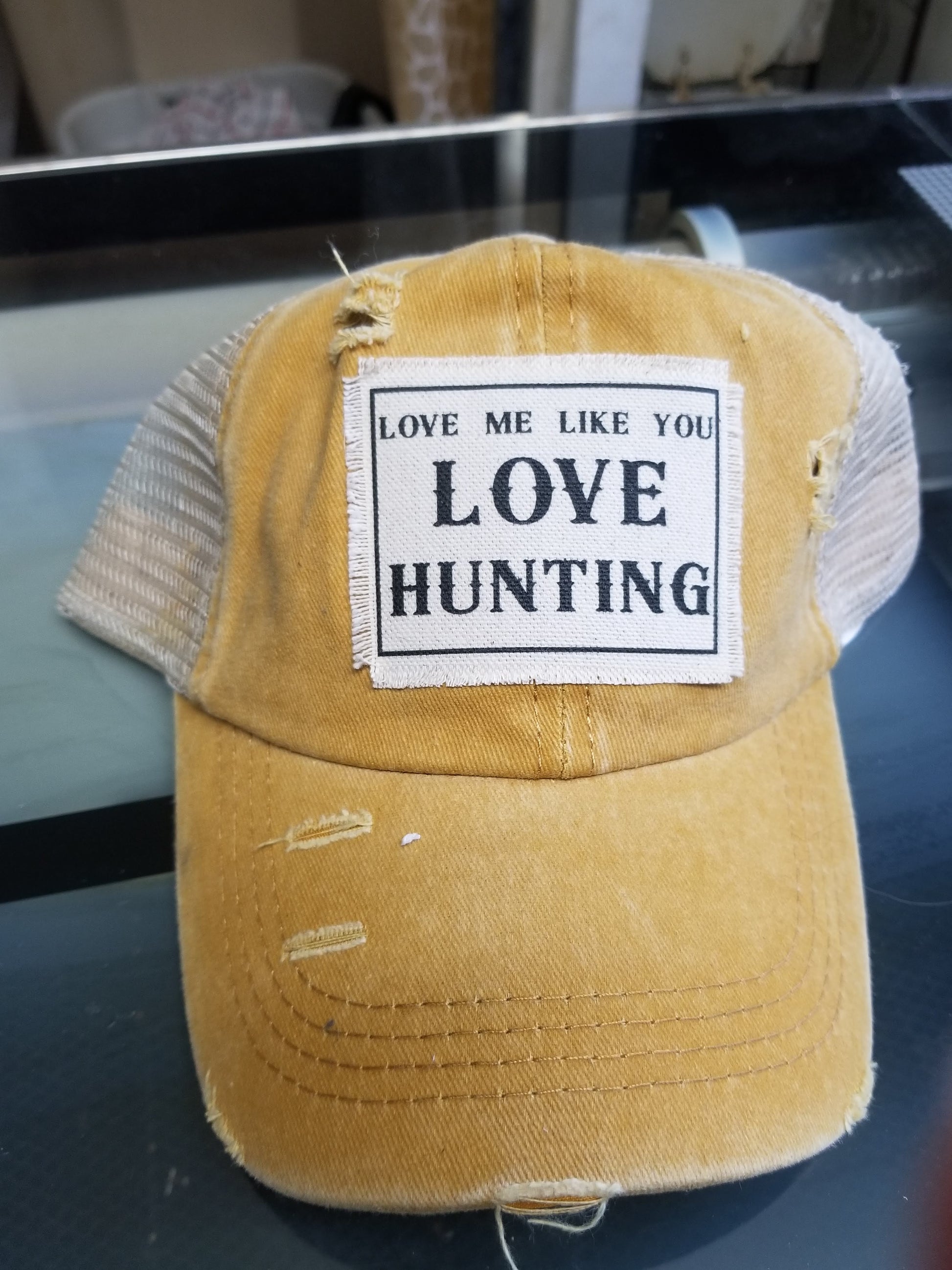 Love me like you love hunting hat on a crisis cross ponytail hat.