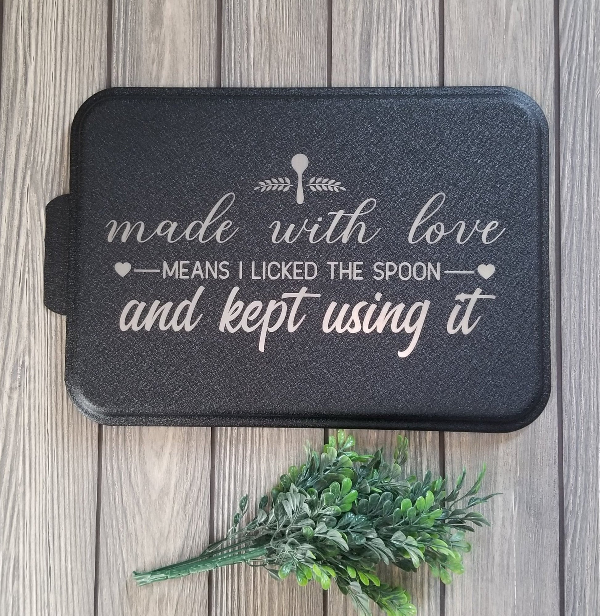 Bake your favorite cakes with a touch of love using our "Made with Love" Engraved Cake Pan and Lid Set. The lid is engraved with the whimsical saying "made with love means I licked the spoon and kept on using it" to add a fun and personalized touch to your baked creations. The set includes a high-quality cake pan and a matching lid available in a range of stylish colors, including teal, red, copper, black, and navy blue. The pan is made of durable materials that ensure even heat distribution and consistent baking results. The lid fits snugly on the pan to keep your baked goods fresh and prevent spills during transport. This set is perfect for home bakers who want to add a little personality to their kitchen essentials, or as a thoughtful gift for a loved one who enjoys baking.