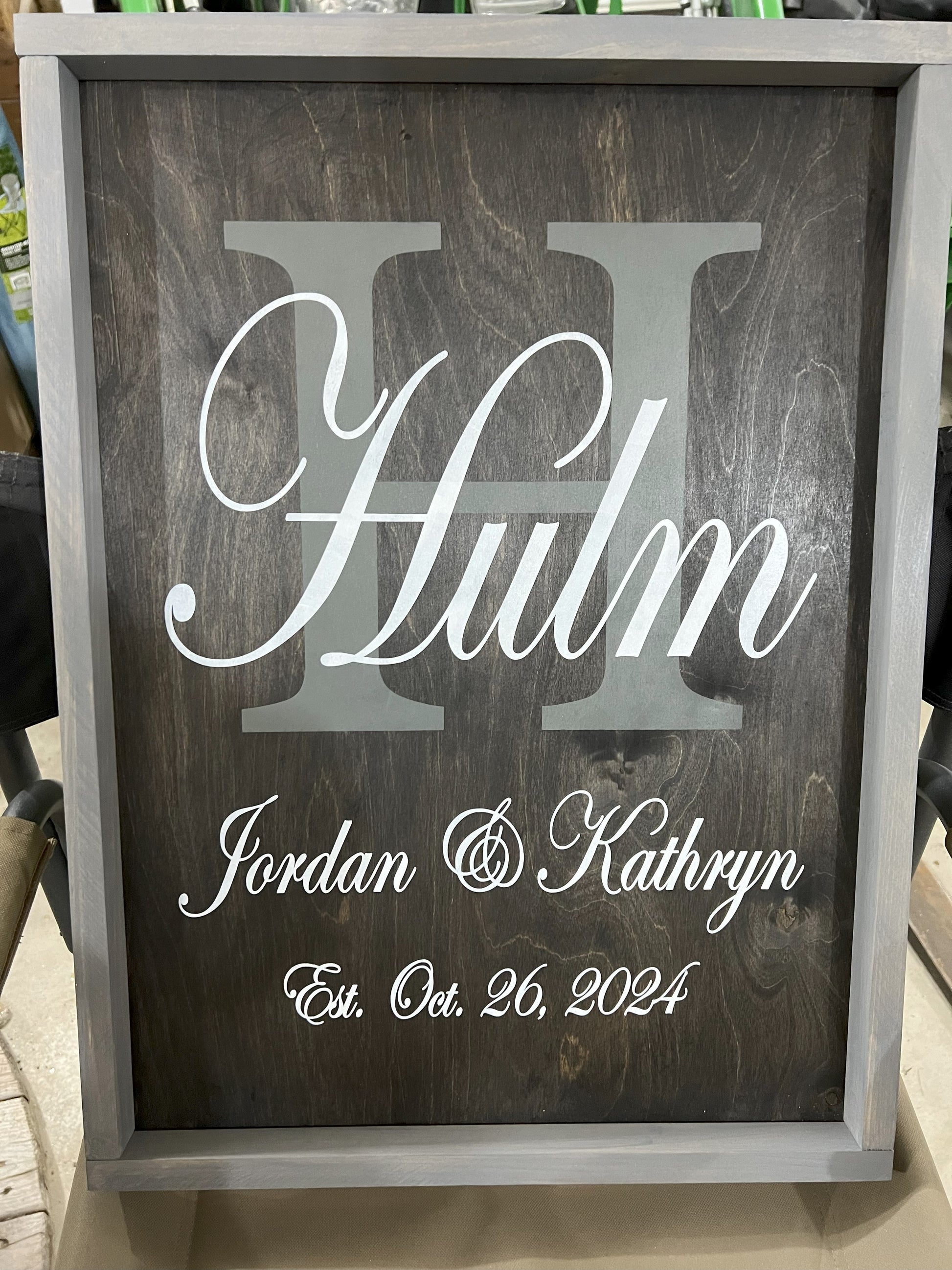 Add a personalized touch to your wedding decor with our custom 18x24 framed wooden sign, featuring a beautiful stained grey frame and a classic black background. This elegant sign is designed to showcase the couple’s new shared last name in timeless white lettering, with a striking monogram-style initial, the full last name, the bride and groom’s first names, and the special wedding date displayed below.