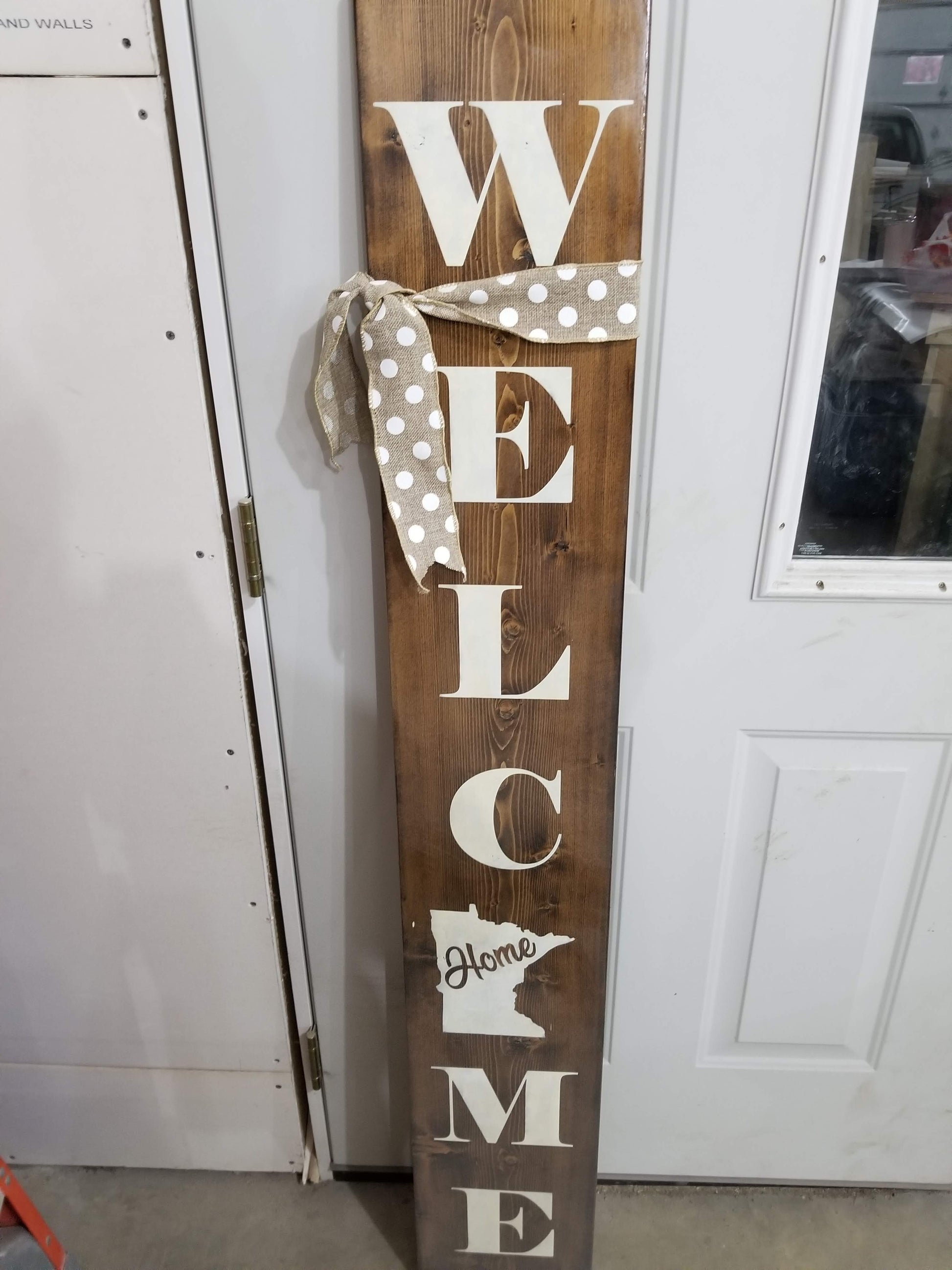 Dark brown or purple Welcome sign with the state of MN as the O. Dimensions are 5' x 10" x 1"